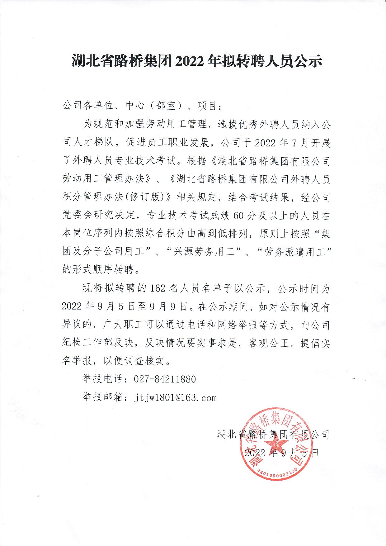 湖北省路橋集團有限公司2022年擬轉聘人員補充公示